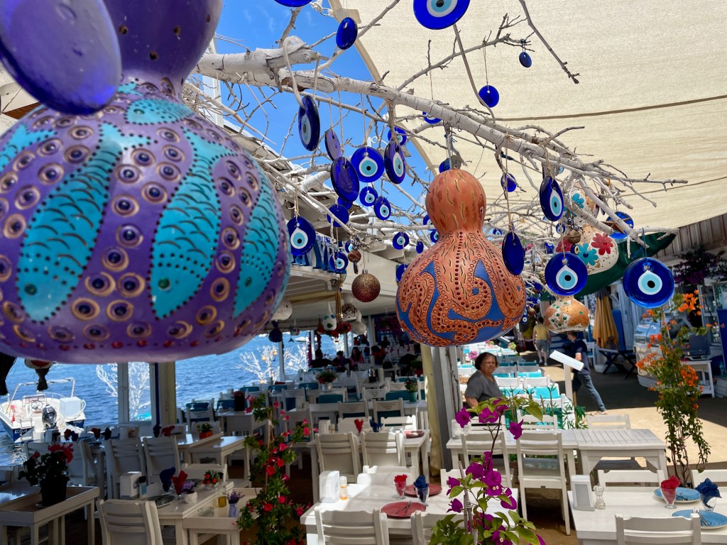 We wandered around the shops and checked out the a waterfront cafes. Evil eyes are a staple of Turkey and this village also featured gourds decorated by hand.
