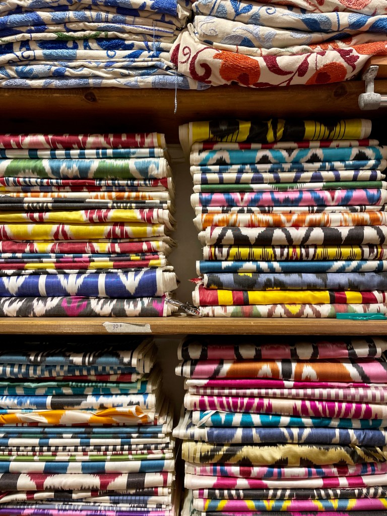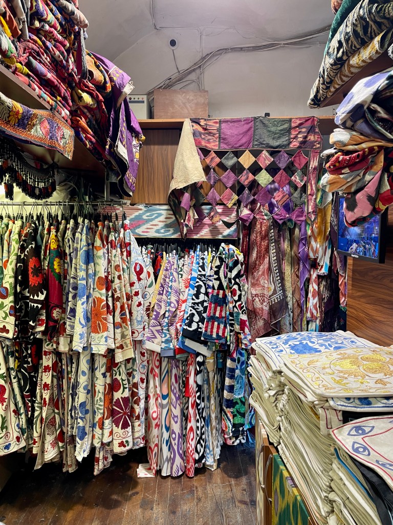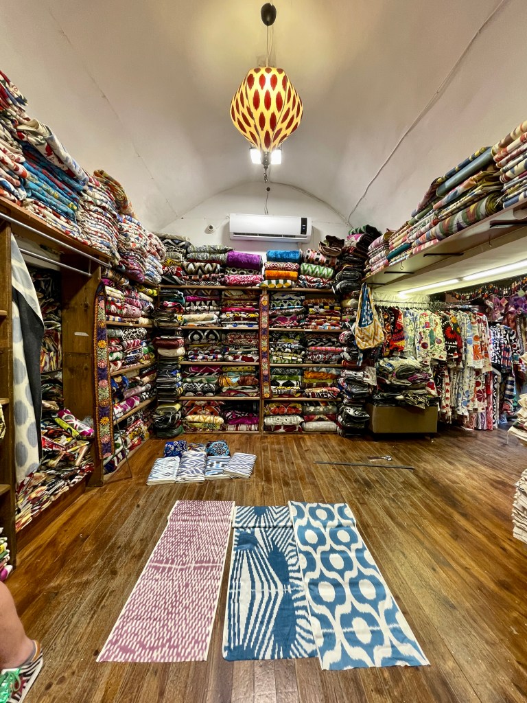 We were ushered into a shop filled floor-to-ceiling with Uzbek fabrics of every pattern and color imaginable. The shopkeepers immediately offered us tea (“chai”), coffee, or water (“su”), as is customary. It was so bloody hot that we gladly accepted a cool drink. Owing to their faith in Mandy’s choice of company (as well as, no doubt, our foreign change purses), we were left alone to make the store our personal closet.